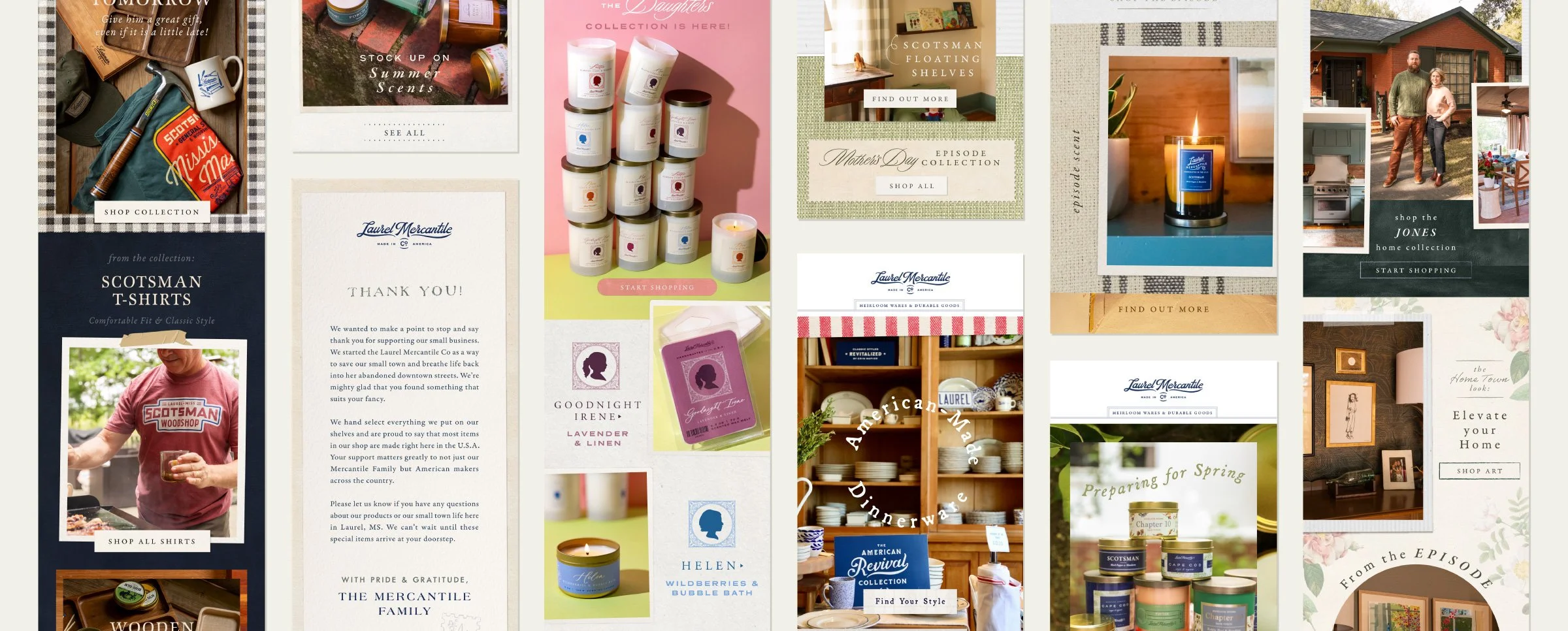 Because of frequent new products and multiple brands, our emails are one of the best places to tell a story to a wide national audience. Graphic design utilized custom typography, illustrations, and thoughtfully-selected textures and images — grabbing attention, conveying the brand message, and boosting engagement with recipients.